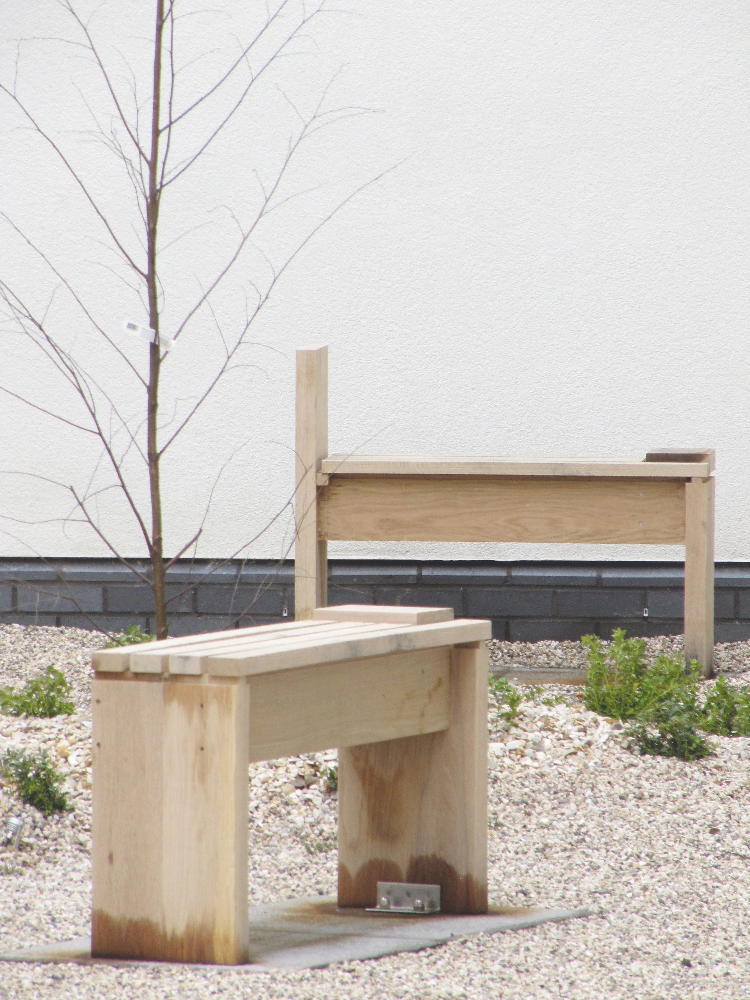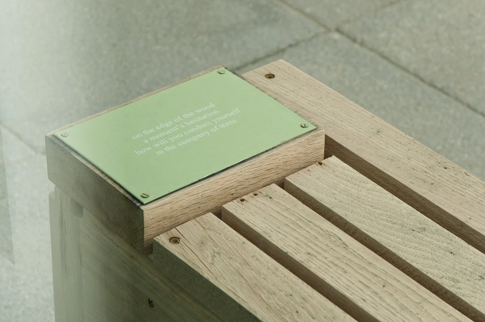 The court itself is landscaped with birch trees, fine gravel with limited ground cover, and paving, giving a variety of surfaces and the opportunity for a meandering walk, with benches at intervals supporting plaques with short poems relating to a woodland walk.