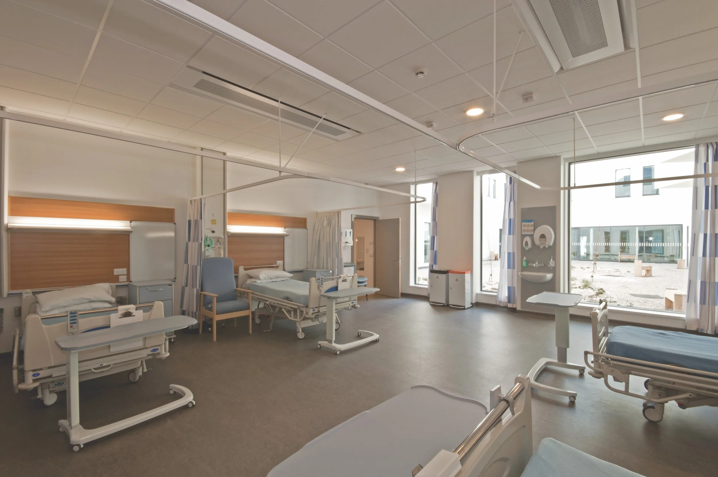 The three storey / 6000m2 Ward Extension, to the New Stobhill Hospital, contains an OPD Clinic, 12 “23 Hour” beds (to extend the use of the existing Day Surgery), a small education/seminar suite and two 24 bed rehabilitation wards - providing a total 60 beds, half of which are provided as single rooms and half in multibed wards to enable a choice of accommodation for the expected age and condition of patients.