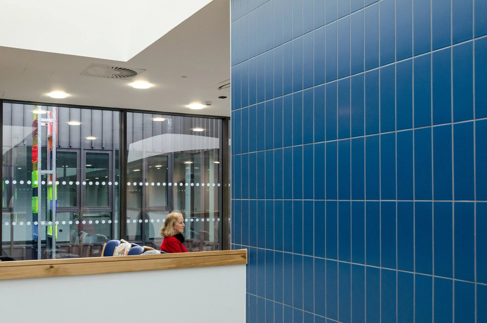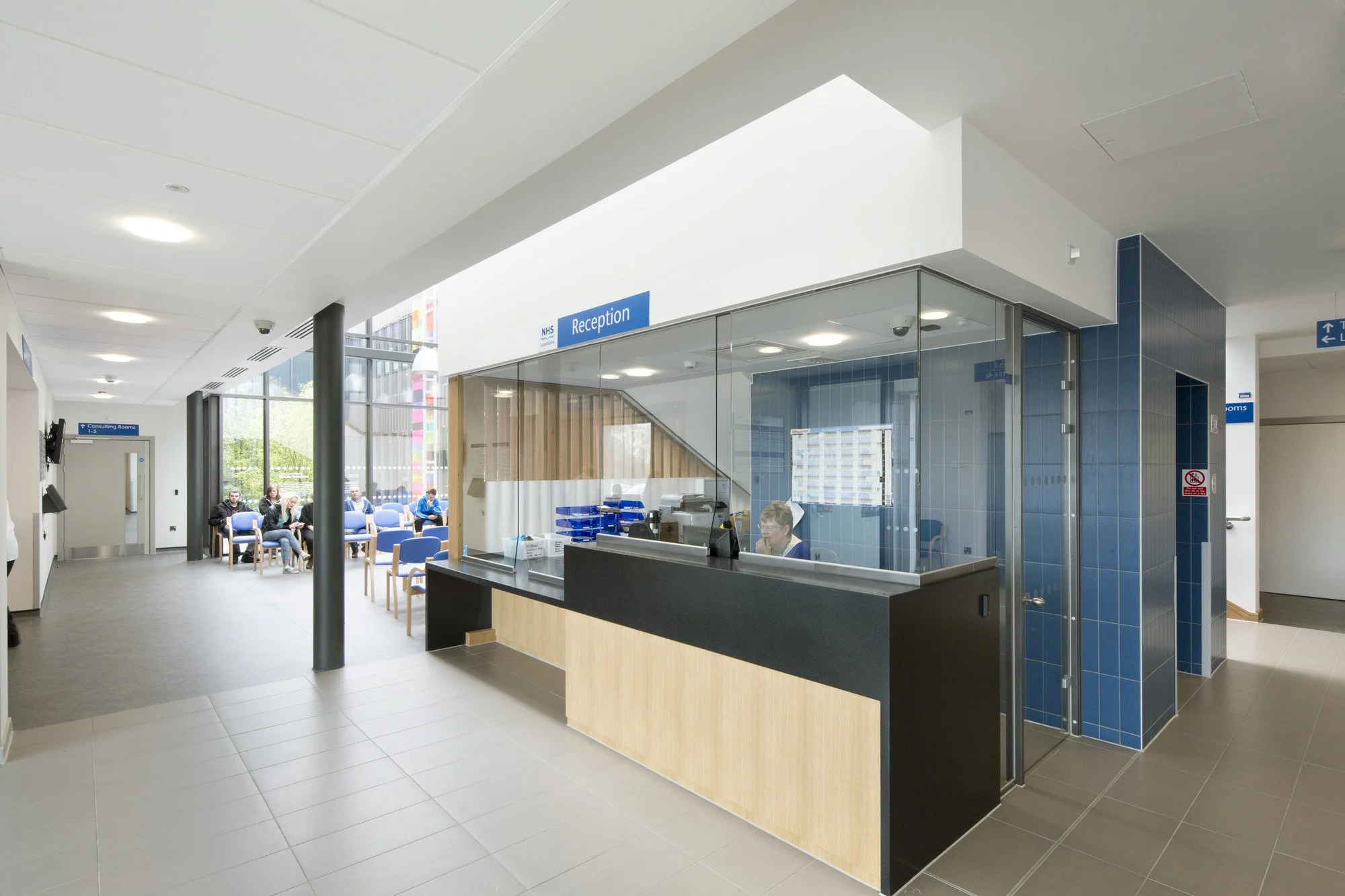 The closed geometry emerges from the requirements of the brief, providing efficiency and economy of movement and services. Most patients visiting health centres are heading for a clear destination, such as the GP practice or NHS clinical accommodation, and they will learn rapidly to find their way. Clear wayfinding is achieved by the excellent visibility up through the atrium and the orientation provided by the consistent placing of waiting areas and vertical circulation at the centre of the plan.