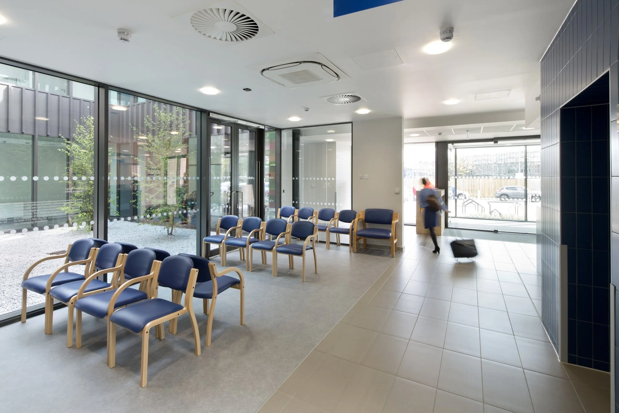 The linear plan provides efficiency and economy of movement and services, and this economic footprint is particularly suited to the site. The patient journey is simple, clear and precise: you enter, arrive at the reception in central space and are directed to the relevant, adjacent waiting area. You orientate yourself towards the courtyards and towards the department you are visiting. The diagram, orientation and wayfinding are logical and easily understood. There are views to the outside at the ends of all corridors. External factors have influenced the design, massing and placement on the site and how the hard and soft landscaping is designed. The design of the building reacts to the pedestrian routes, the traffic routes and the topography of the site.