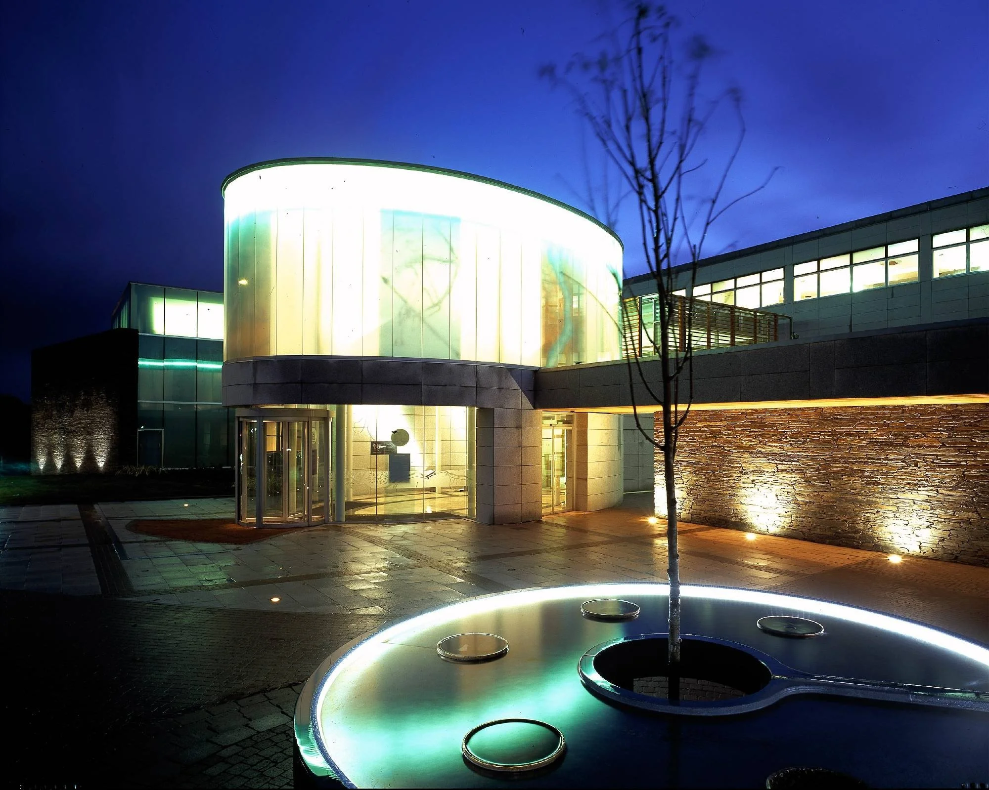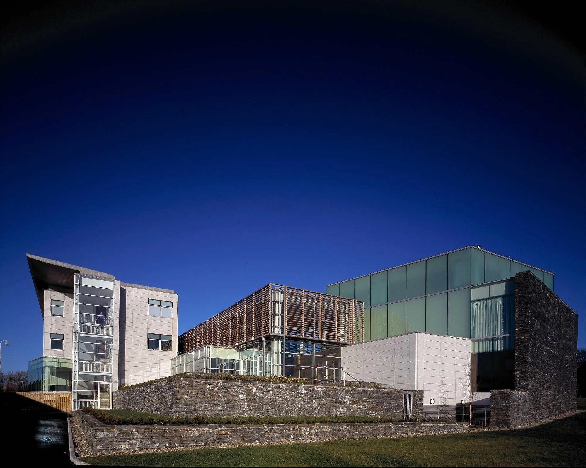 Coleraine Borough Council New Headquarters sits within a sloping riverside site. The building takes its linear form from the linear nature of the site, river and road. The linearity is then eroded to include a courtyard and terraces. The building reflects the horizontal nature of the site strata in its horizontal elements. The building sits upon a plinth, emerging from the ground.