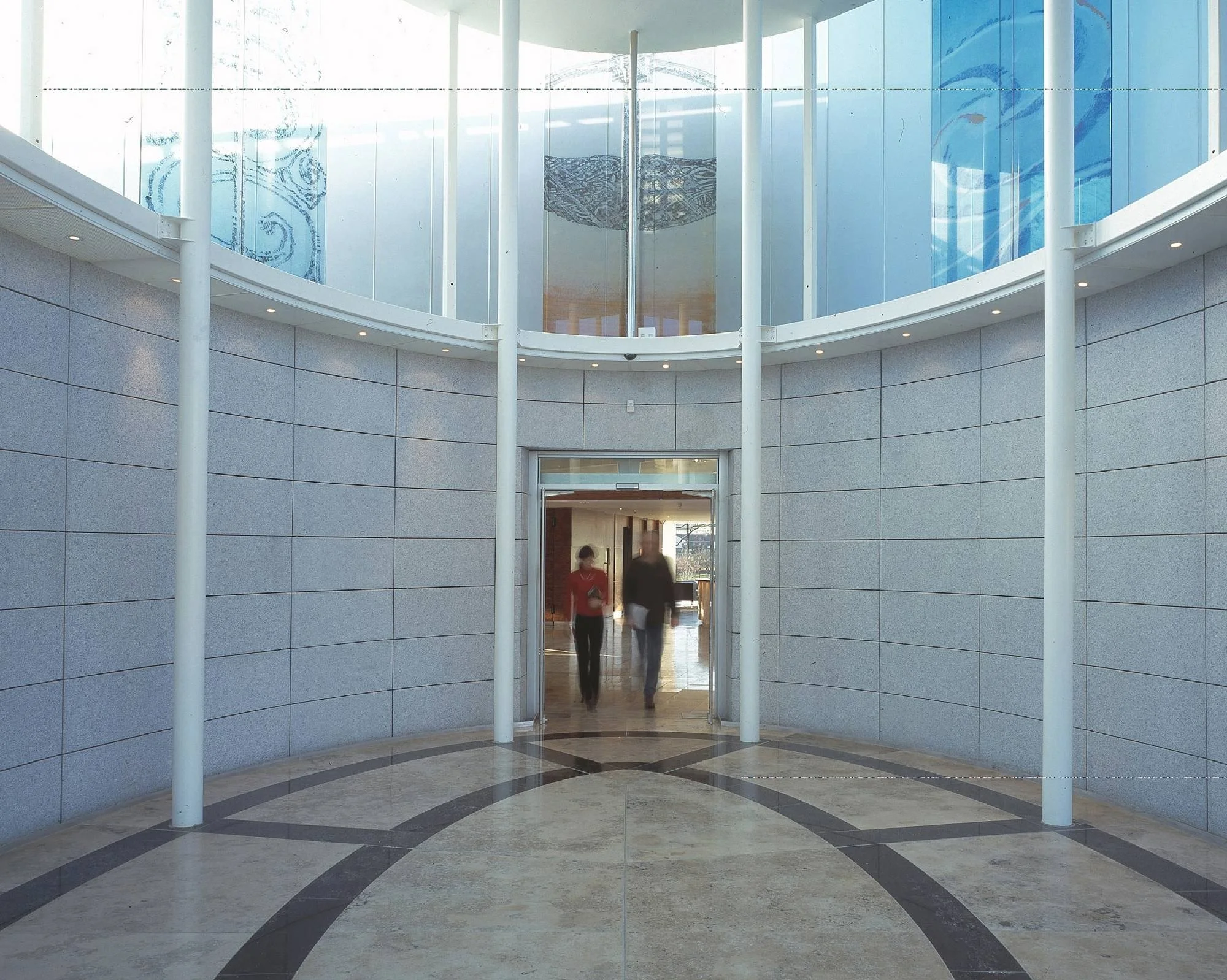 A rubble stone plinth, softening and blurring the connection of the building to the ground, forms the base of the Council Headquarters. Above this plinth the building becomes a series of geometric elements clearly defined against the sky, river and trees. Some elements are seen as part of the landscape and some are not. It becomes a man-made landmark within a natural landscape. The building is divided into different uses; offices, civic chambers, a civic entrance and a wedding suite. Each different function is reflected in the relevant building form. The building is readily identifiable – it develops a status and symbolism within the local community. The offices are modern functional flexible spaces. Their external treatment reflects this functionality in the module used to annotate the facades. The council chamber provides focus to the civic chambers - importance is reflected in a clear distinctive form and position. The main civic entrance - seen as a lantern, a portico a beacon - is called out as a curving glazed ellipse defined against the simple backdrop of the council offices. The entrance court and two terraces are differently landscaped to again reflect their separate functions.