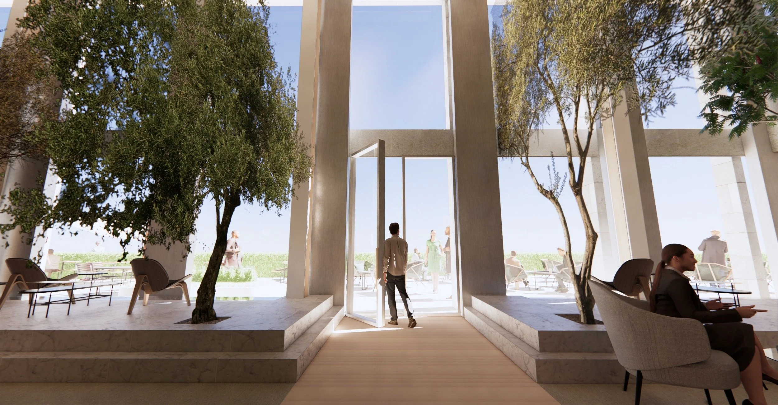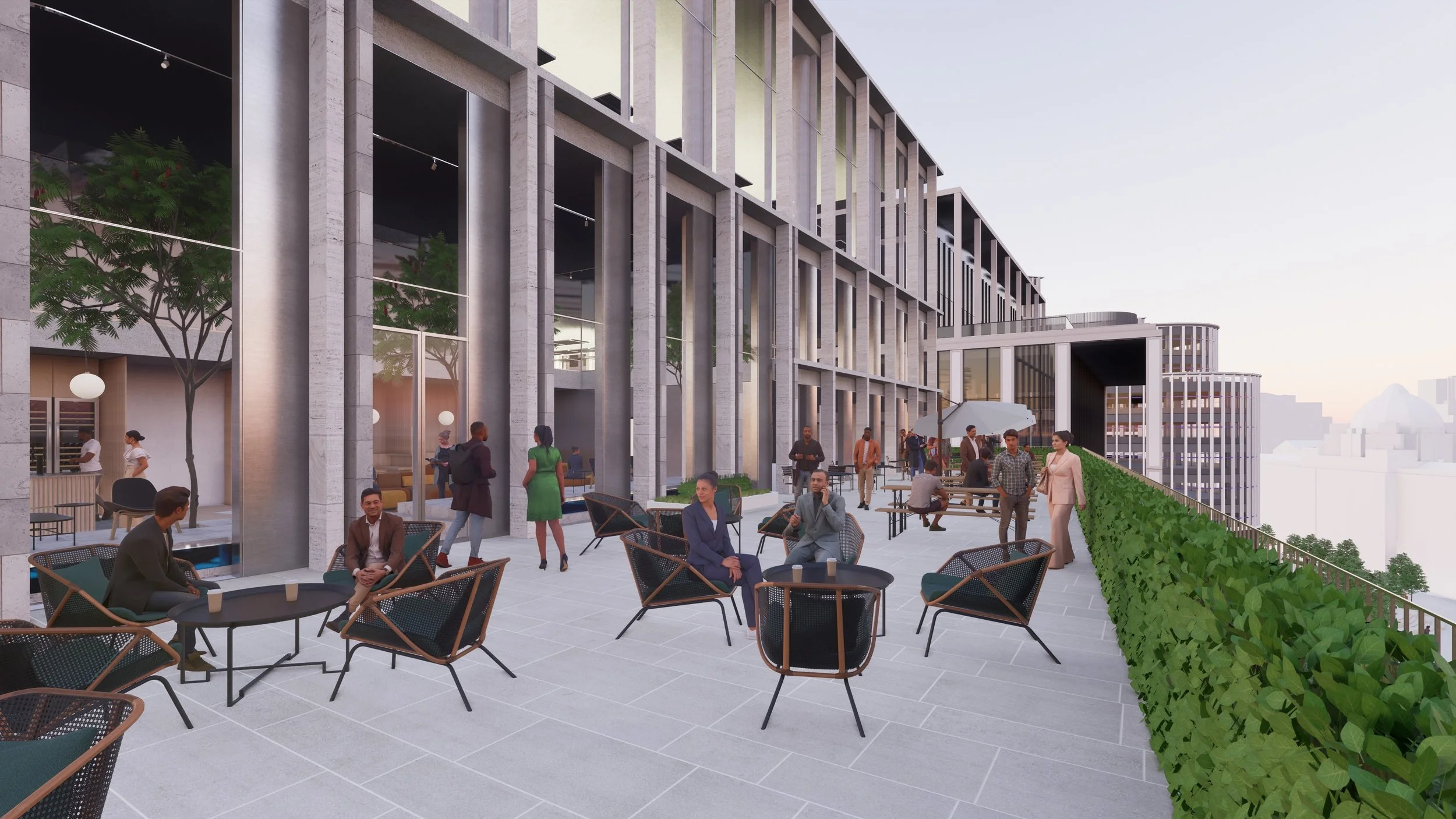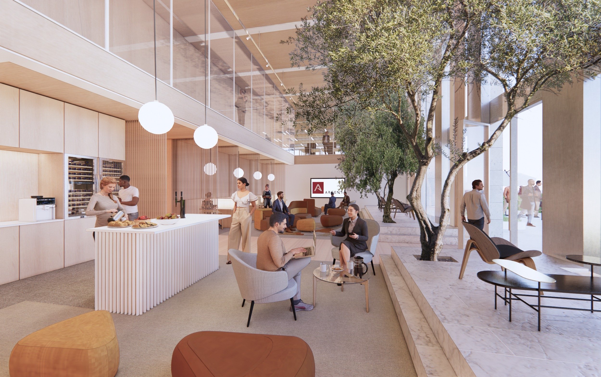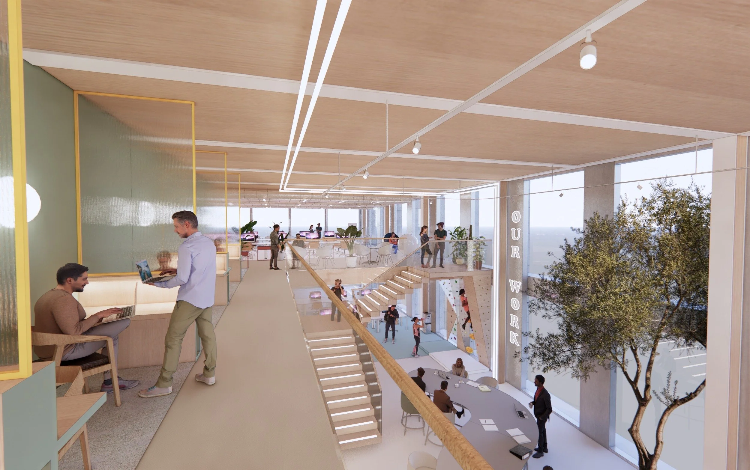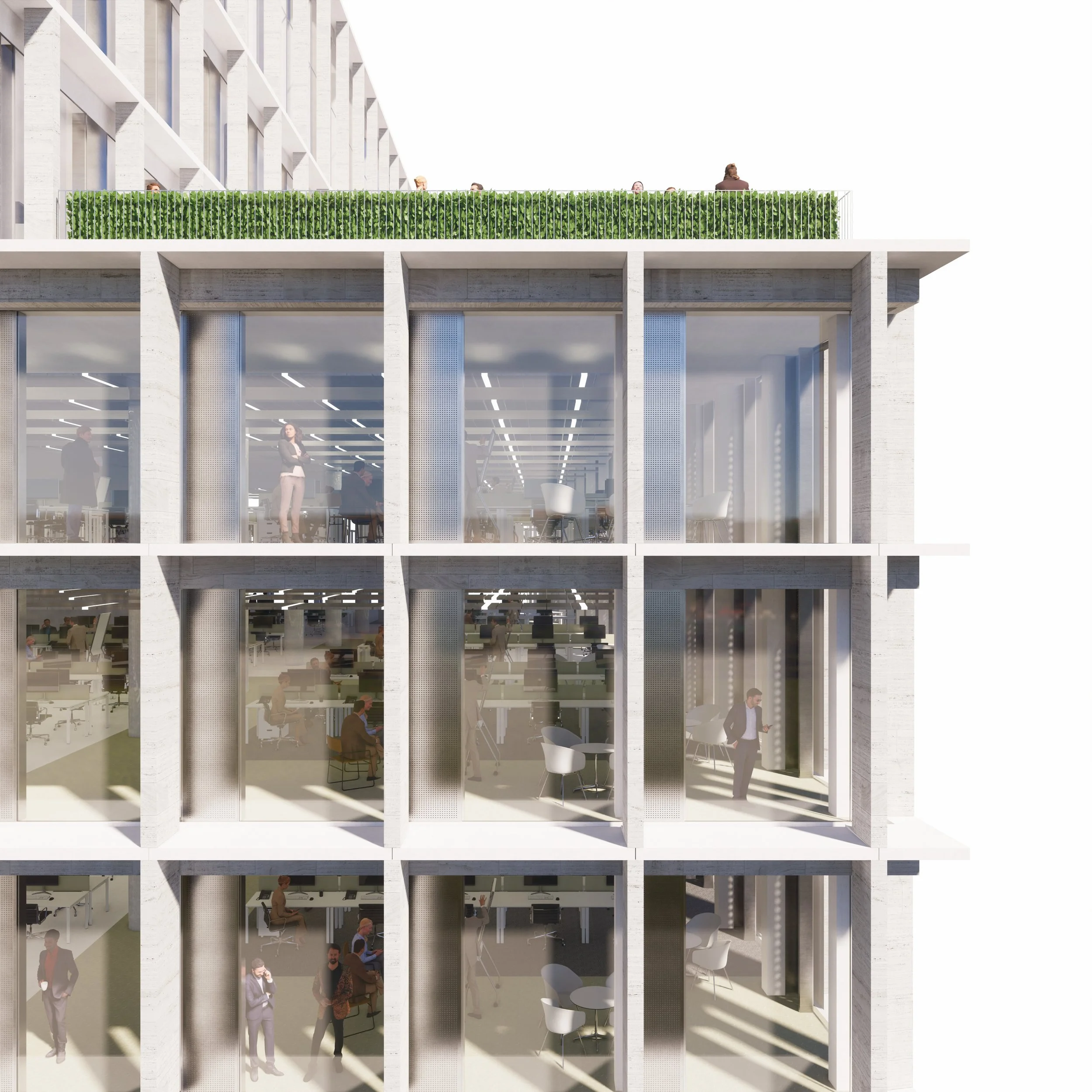 The design celebrates the seamless integration of nature into the workspace, creating a vibrant environment where wellness, creativity, and productivity flourish. Generous glazing on all sides floods the interior with daylight, connecting the building’s occupants to the outdoors while promoting a sense of openness and energy. Fresh air flows through opening windows on each floor, and a rooftop terrace offers a space to breathe, relax, and engage with the city’s skyline. These elements are complemented by the use of organic, exposed materials that ground the building in its environment, fostering a strong sense of place.