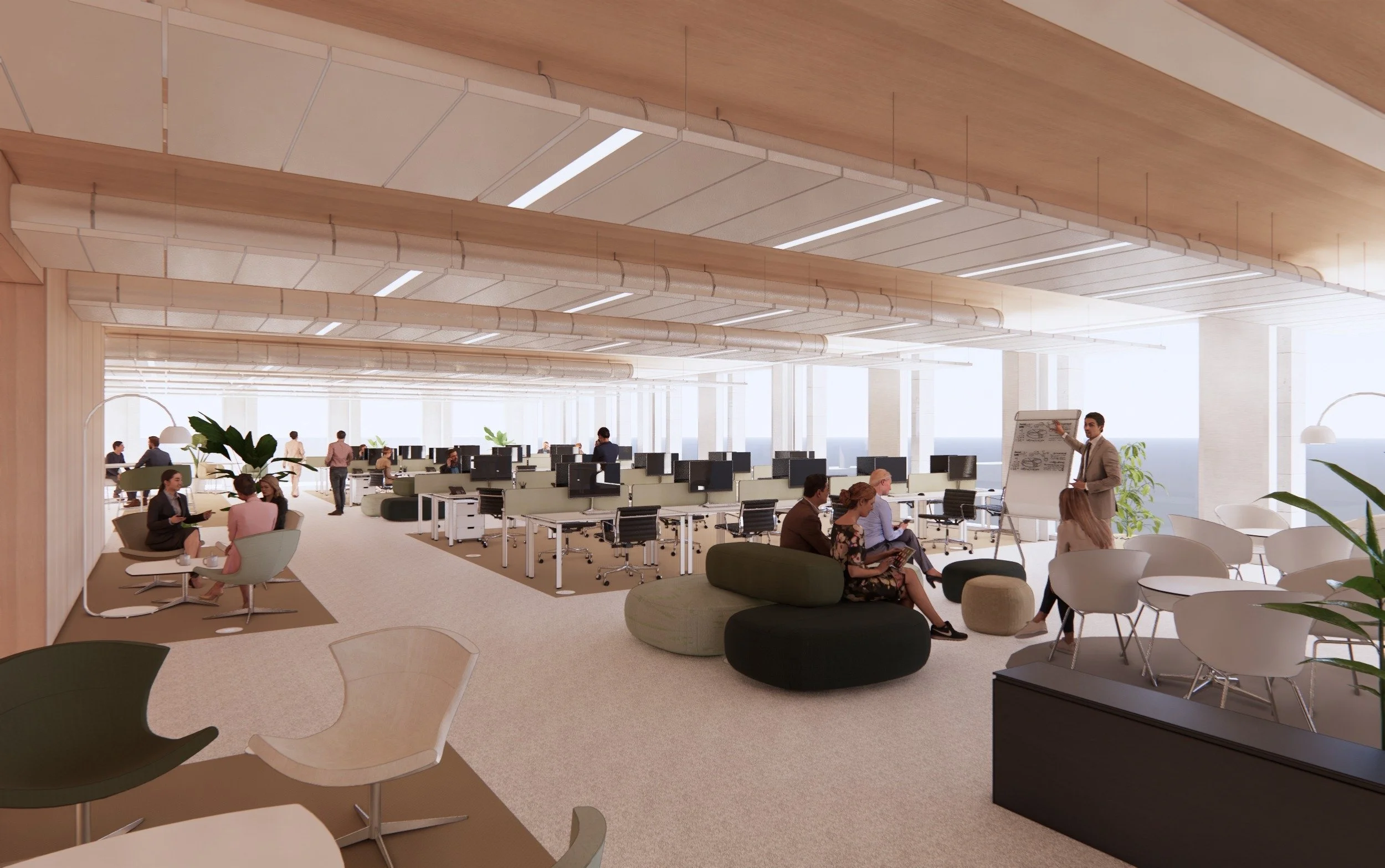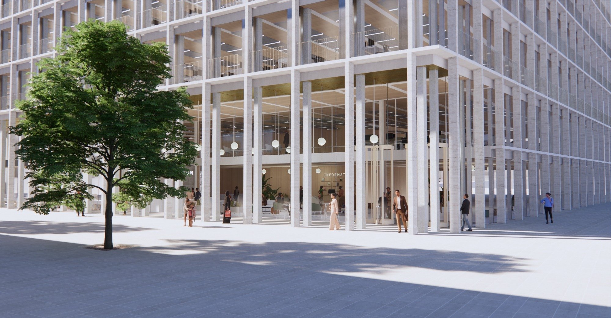 The building’s flexible floorplates are designed to evolve with the needs of its occupants, encouraging collaboration and adaptability. Soft spots near the facades allow for interconnecting spaces, while double-height public rooms create focal points that invite interaction, forming a hub for ideas and innovation. This commitment to openness and connectivity reflects the building’s broader civic-minded approach, positioning office spaces not just as workplaces but as essential parts of a thriving urban fabric.
