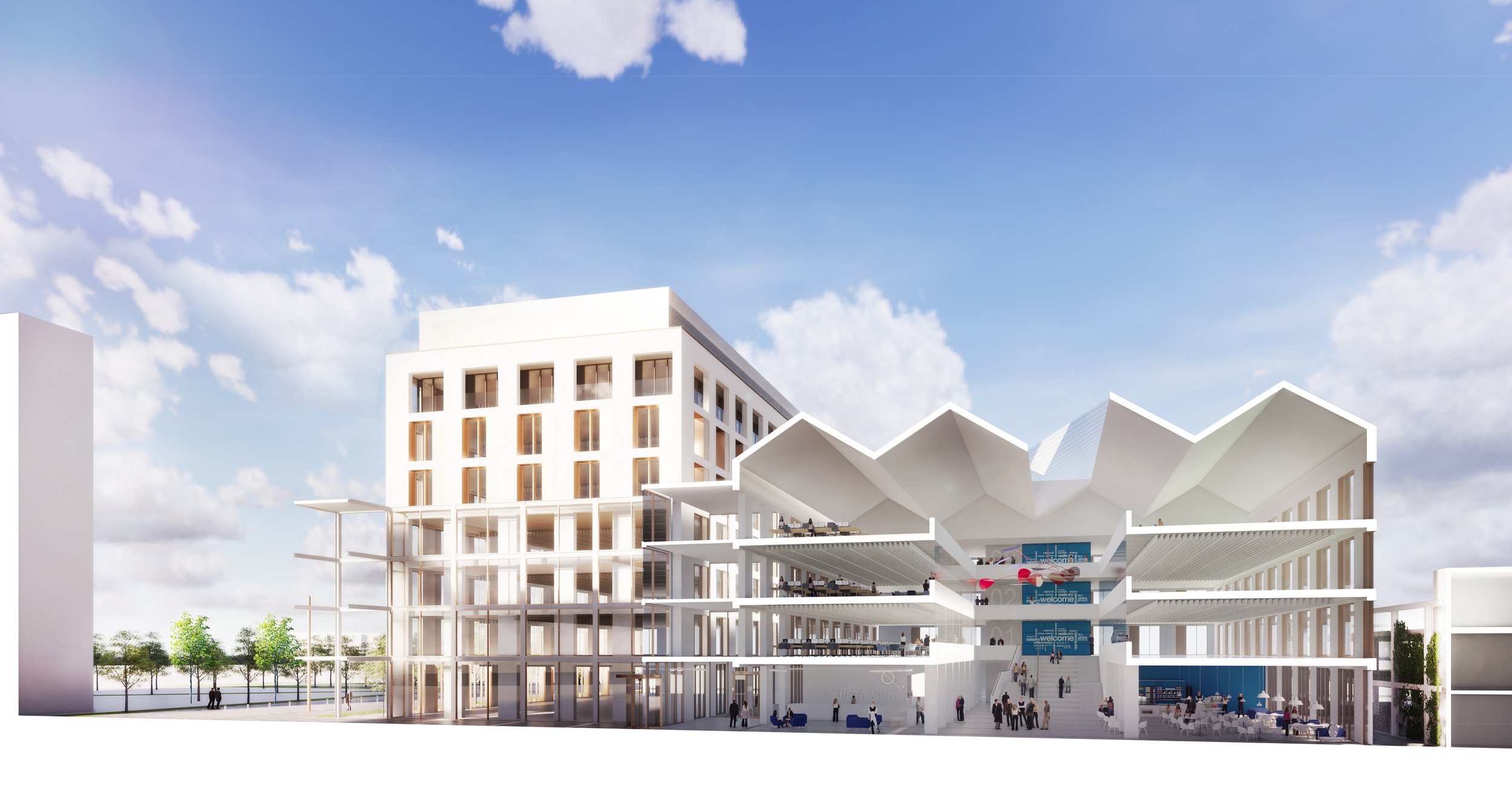 The Town Hall is organised around a central atrium, acting as a social hub that accommodates gatherings, conferences, and informal meetings. This dynamic space spills out onto a landscaped garden, fostering connections with nature. The Tower serves as a prominent marker within the masterplan, offering flexible office spaces that capitalise on stunning views of the surrounding landscape. Meanwhile, The Terrace provides a series of interconnected spaces designed to encourage collaboration and knowledge exchange among tenants.